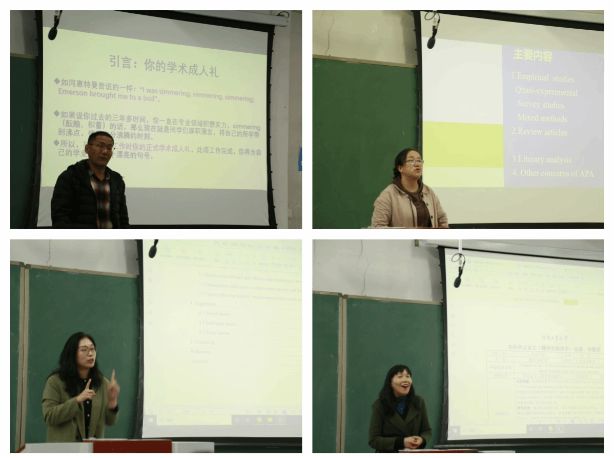 随后,优秀指导教师代表杨新立、廖智英、康方、杜巧阁四位老师分别分享了他们在毕业论文指导中的宝贵经验。杨新立以文学方向为例,深入剖析论文写作的关键要素与常见误区;廖智英重点介绍了英语专业实证研究论文的体裁特征与学术规范;康方通过展示往届省级优秀毕业论文,帮助学生了解高质量论文的标准与写作思路;杜巧阁则围绕翻译专业的翻译实践报告,从写作框架、学术价值与规范要求等方面进行了系统讲解。