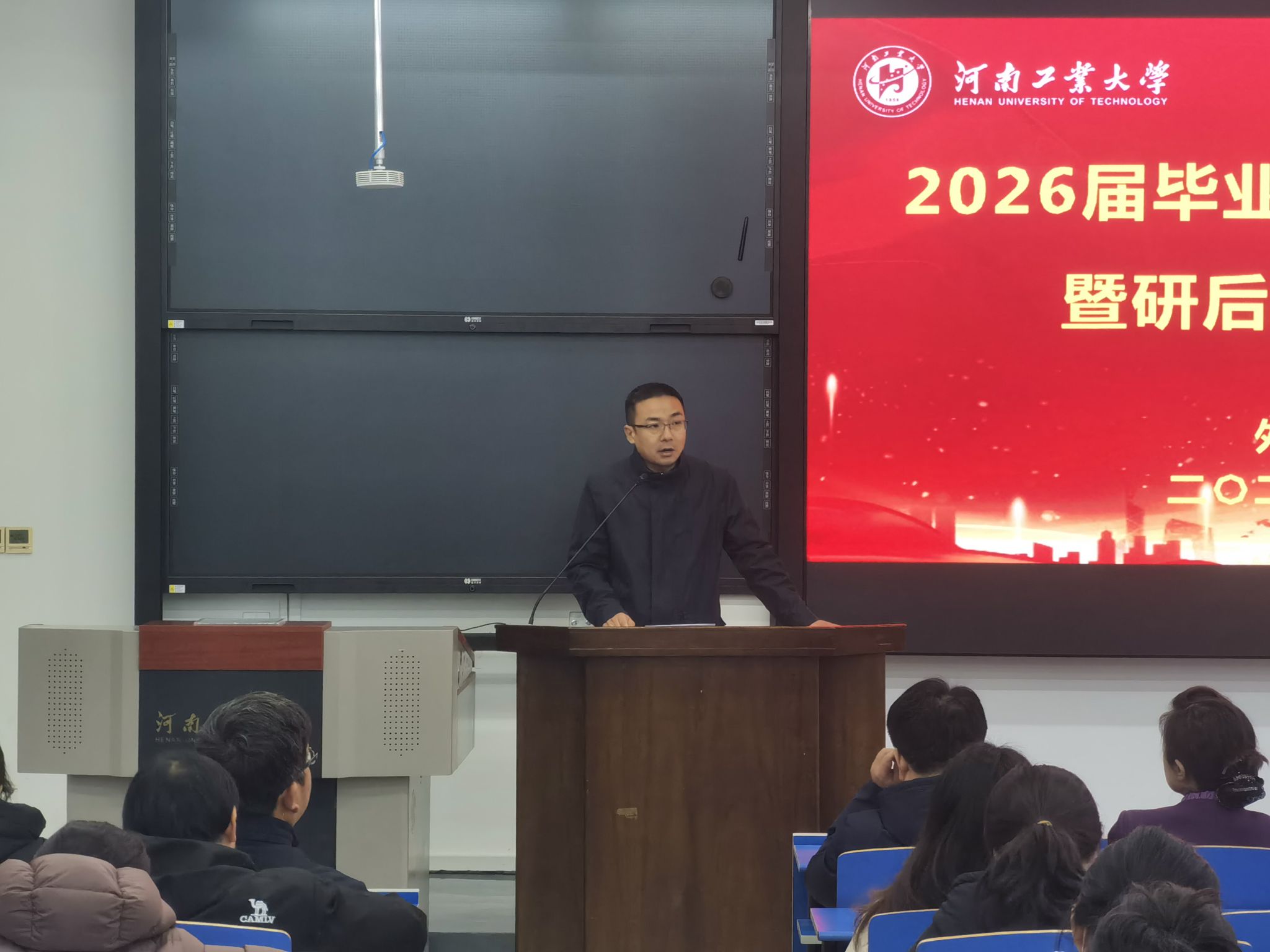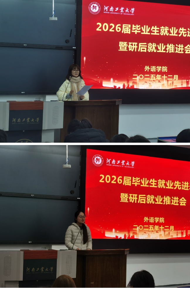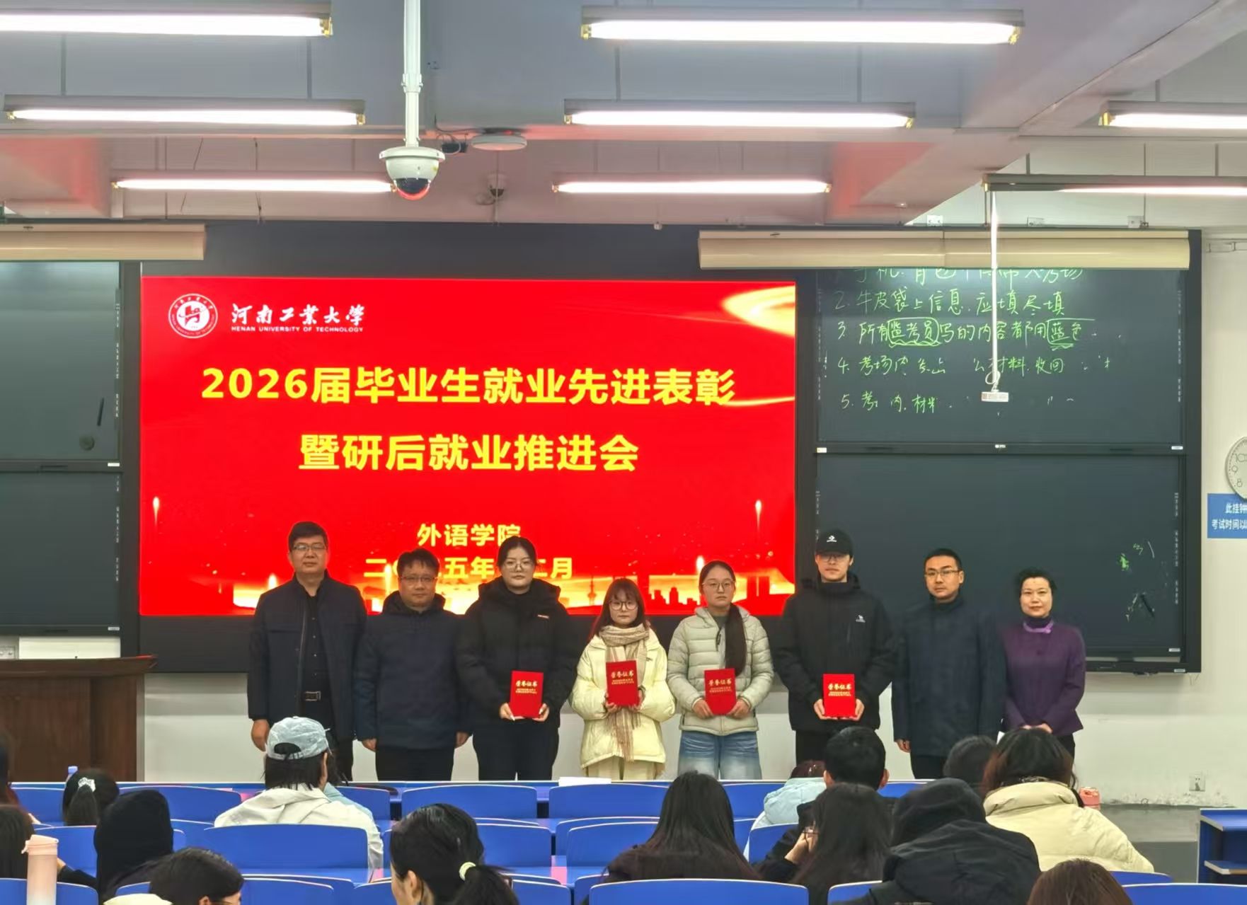 在4220教室举办2026届毕业生就业先进表彰暨就业推进会。国产av党委书记王云涛、副书记王晓东、副院长葛丽萍、副院长沈国荣、毕业班辅导员郭珊珊及2026届全体毕业生参加会议。